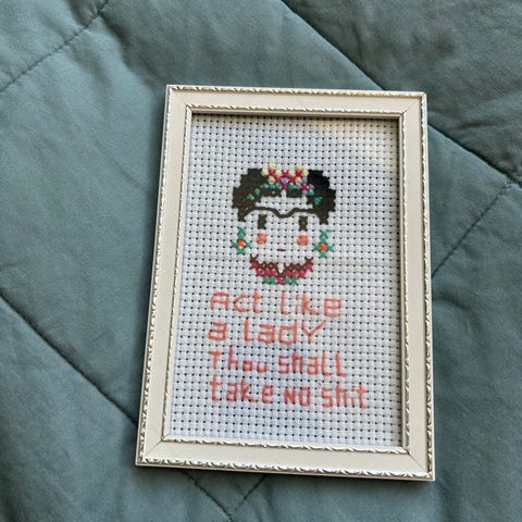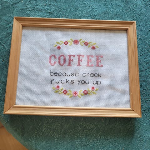 Rammen er laget av papp. Jeg har limt på blomster laget av gips. Om du ønsker bruke en annen ramme, kan broderiet enkelt fjernet og settes i en annen ramme.
