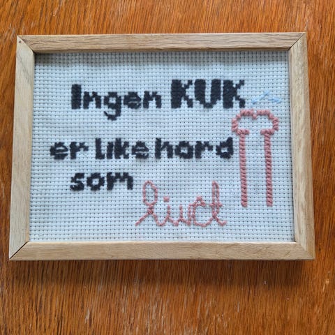 Rammen er laget av papp. Jeg har limt på blomster laget av gips. Om du ønsker bruke en annen ramme, kan broderiet enkelt fjernet og settes i en annen ramme.