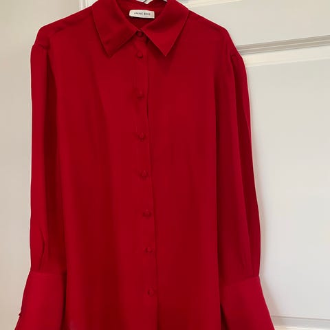 Anine Bing bluse for dame i størrelse S. Blusen er svart og laget av 100 % silke. Modellen har lange ermer med mansjetter, klassisk krage og knappelukking foran. Stoffet er lett og delvis gjennomsiktig med små dekorative perledetaljer. Passer til både hverdags- og penere antrekk avhengig av styling. Vaskes og vedlikeholdes etter anvisning på care-lappen (ikke maskinvask, skånsom behandling anbefales).se gjerne mine andre annonser