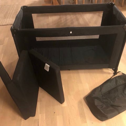 Basson Baby reiseseng i svart stoff. Selges med tykk madrass som vist på bildene.