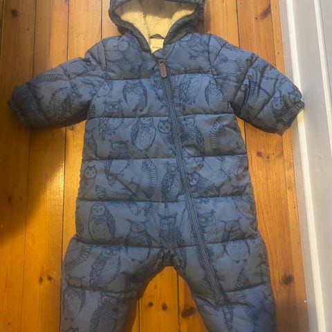 Selger en pent brukt vinterdress fra Name It i størrelse 80 (ca. 9–12 mnd). Dressen har et stilig mønster med retro biler og en flott fuskepelskant på hetten.