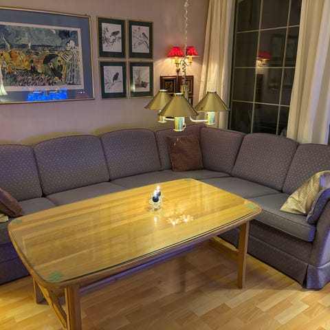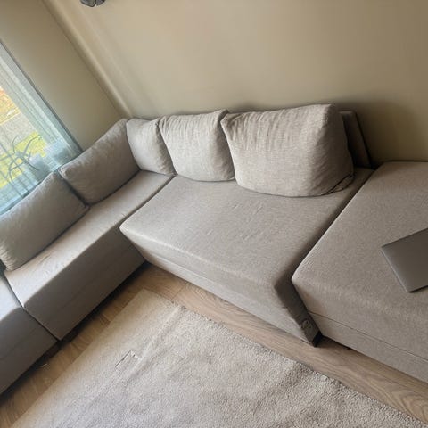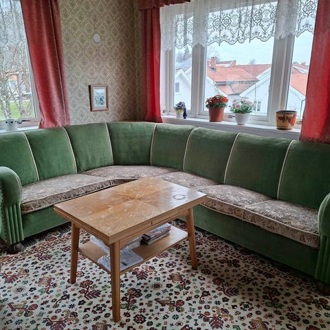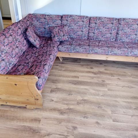 Dette er en sofa som vangene kan flyttes på. Denne kan passe på en koselig familiehytte 😊
