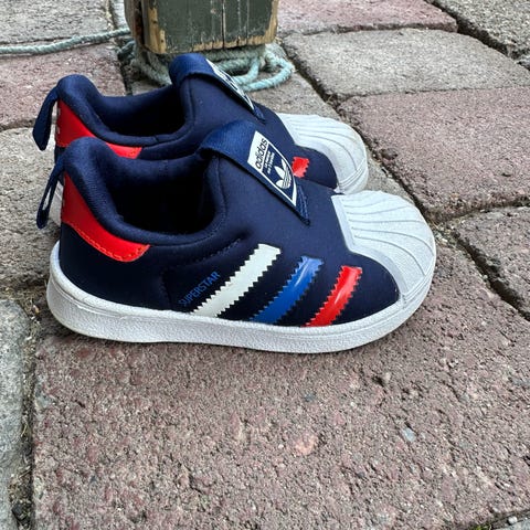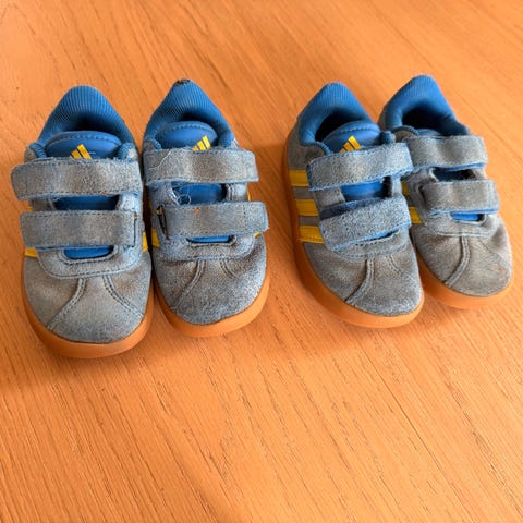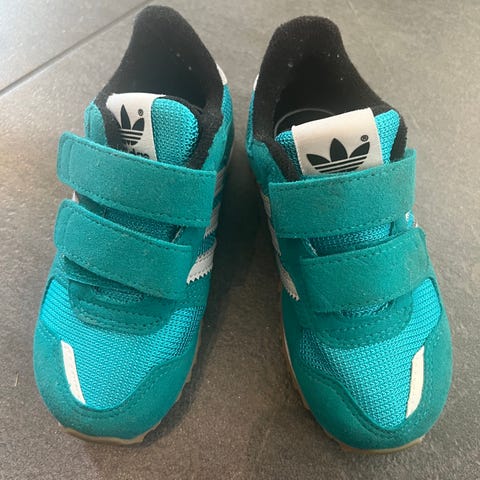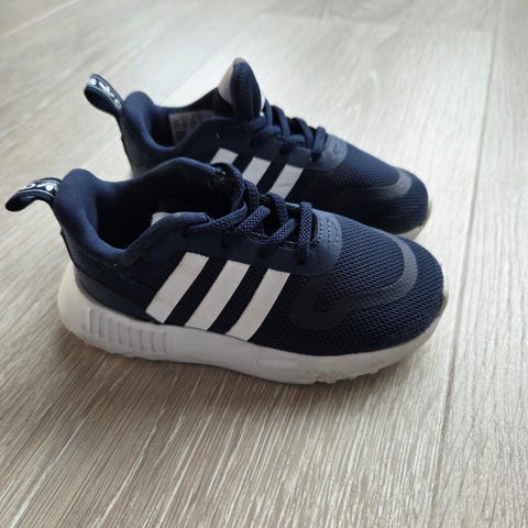 Adidas joggesko for barn, unisex. Skoene er i blå farge med hvite detaljer og oransje felt bak. Overdelen er i pustende mesh-tekstiler med borrelåslukking og lisser for enkel av- og påtaking. Sålen er i lys gummi/syntetisk materiale som gir godt grep. Egnet som hverdagssko og til lett aktivitet for barn.