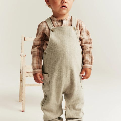 Lil'Atelier sett med bukse og skjorte til gutt i størrelse 98. Sett i brun farge, laget i mykt kordfløyelsstoff. Buksen har knepping.