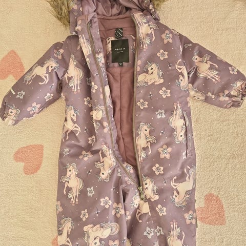 Name it parkdress for jente i størrelse 98. Dressen er lilla med mønster. Den har hette, glidelåslukking foran og strikk ved ermer og benåpninger. Passer som yttertøy for barn i aktuell størrelse.