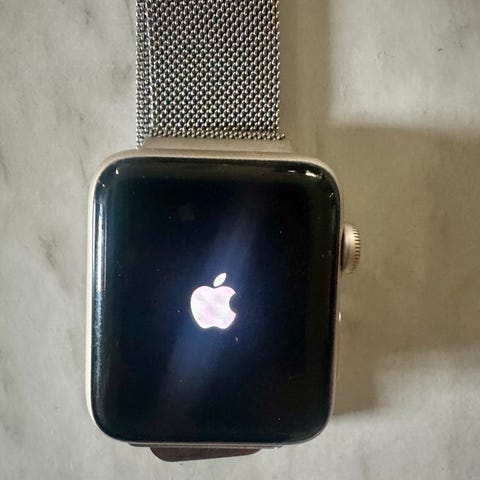 Apple smartklokke for unisex med rektangulær skjerm og grønn silikonreim med blomsterpregede detaljer. Klokken har berøringsskjerm og sensorer på baksiden for måling av aktivitet og helsefunksjoner. Passer til daglig bruk, trening og varslinger fra tilkoblet Apple-enhet. Reimen har justerbar lengde med hullfeste for tilpasning til håndleddet.