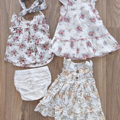Har flere dresser, jakker og klær til jente. Mye kjoler og sommerklær. Si fra om det er noe du er på utkikk etter da jeg har veldig mye klær liggende til jente mellom str 50 og 74.
