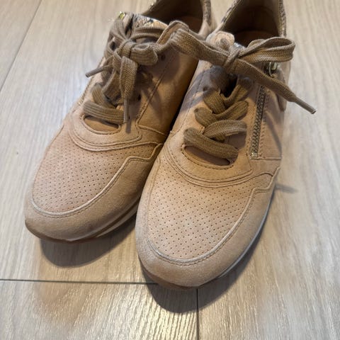 Gabor sneakers/joggesko i størrelse 38, 5. Skoene er i en rosa farge med brede lisser og profilert lys rosa / beige såle. Overdelen er i semsket materiale, og innsiden har myk innersåle med merking «Best fitting». Modellen har lavt skaft og er egnet til hverdagsbruk og fritid i milde sesonger.