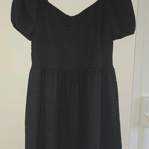 By Lien hverdagskjole for dame i størrelse XS. Kjolen er svart og laget av polyester. Den har korte puffede ermer, kvadratisk utringning og innsydd strikk i midjen for en definert passform. Lengden går omtrent til kneet eller litt under, avhengig av høyde. Egner seg til hverdagsbruk og enkle anledninger.