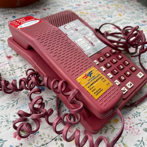Grønn retro bordtelefon med dreieskive. Telefonen har håndsett og base i ett stykke, med innebygget høyttaler og mikrofon i henholdsvis øvre og nedre del. Undersiden har dreieskive med tallknapper og en stor rød knapp i midten. Passer som dekorativ gjenstand.