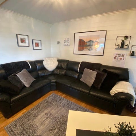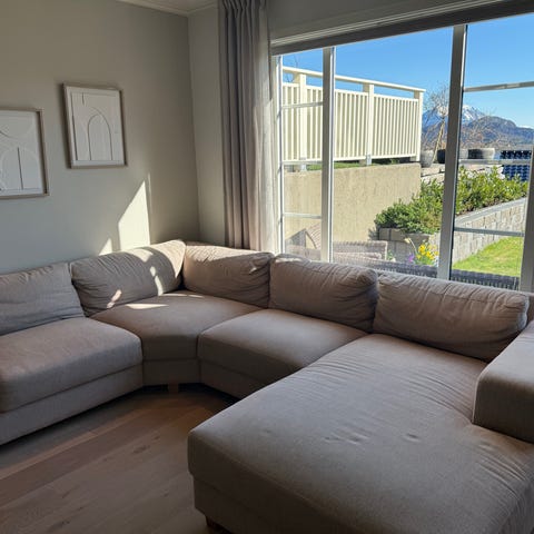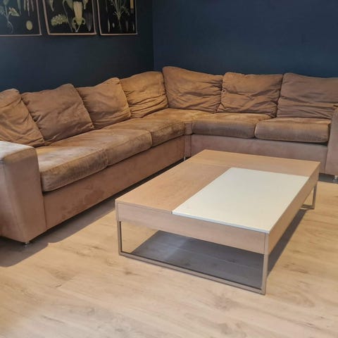 Gis bort mot henting, jeg kan hjelpe med bæring. Må hetes innen 27/3 pga flytting. Imitert semsket skinn. Høyde 76, dybde 77, lengde 248 + 195 cm.