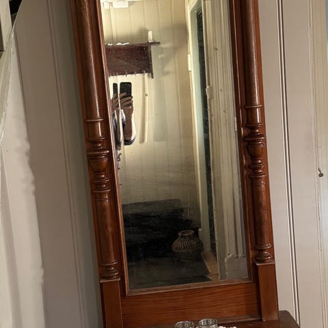 Eldre vegg eller sminkespeil med bølgeformet ramme i treverk. Speilet har rektangulær grunnform med organiske, buede kanter. Baksiden har oppheng med vaier for montering på vegg. Passer for bruk i gang, soverom eller andre rom der det er behov for et mindre veggspeil.