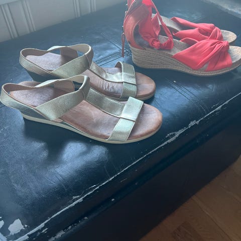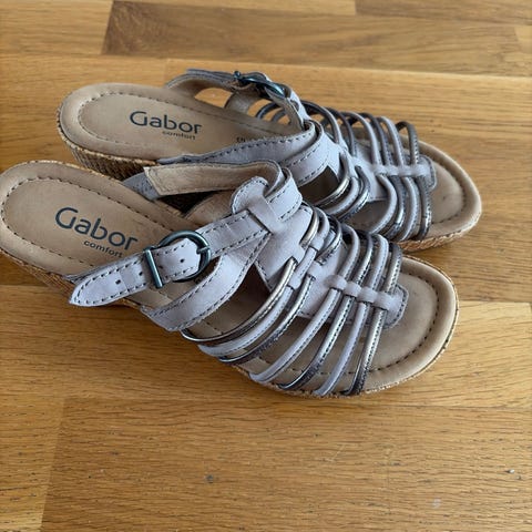 Fine mørkeblå / sorte Gabor sandaler i størrelse 38, 5 Modellen har kilehæl og justerbar rem med spenne. Sandalene er i mørkeblått semsket skinn med brede remmer over foten og forfoten. Sålen er lett profilert for bedre grep. Passer til hverdagsbruk og penere anledninger i varme sesonger. Helhøyde er ca. 7 cm. Brukt kun ved to anledninger og er behagelige å gå med.