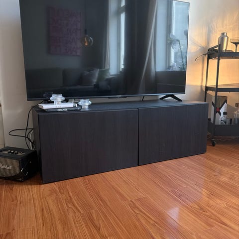 Pent brukt tv-benk i svart og mørkt tre (imitert). Må hentes i Hamar. Fargen er mest lik det første bildet.