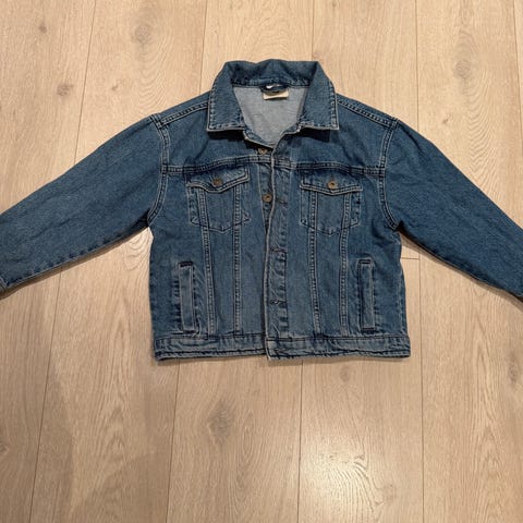 Selger en LAB denimjakke med collegestoff i ermer og hette. Hetten er avtakbar.