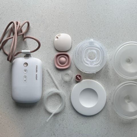 Philips Avent elektrisk brystpumpe i hvit farge. Enheten består av pumpehus med betjeningsknapper, slange og brysttrakt med tilhørende deler. Brystpumpen er beregnet for uttak av morsmelk og kan brukes hjemme eller på farten. Produktet drives elektrisk og har kompakt design som gjør det enkelt å håndtere og oppbevare.