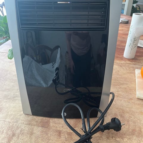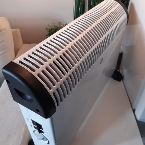 Modellen har digitalt betjeningspanel på toppen med flere knapper for innstillinger, blant annet av/på, temperaturjustering, tidsur og ulike driftsmoduser. Ovnen står på en rund fot som gir stabil plassering på gulv. Egnet for bruk innendørs til oppvarming av mindre rom eller områder, for eksempel stue, soverom eller hjemmekontor. Strømkabel følger med og kobles til vanlig stikkontakt.