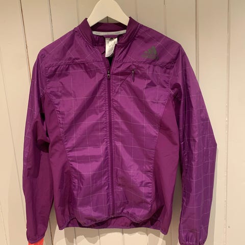 Lys grønn/pastellgrønn løpejakke fra Adidas i størrelse S. Jakken har refleksdetaljer på rygg og bryst. På bildene kan disse partiene se litt grå ut, men de er lysegrønne i virkeligheten også.