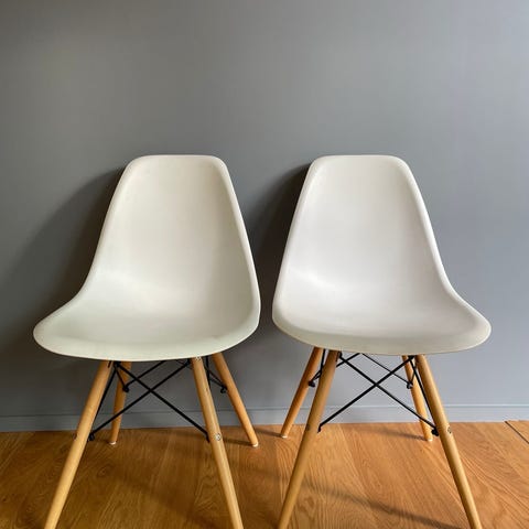 To hvite stoler med trebein. Selges per stk