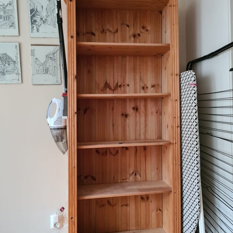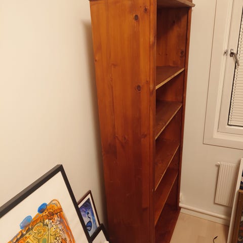 Bokhylle i furu, høyde: 183, Bredde: 74, Dybde 29. stabil og stødig hylle. Noe blass/sliten i lakken uten at det går utover bruken. Må hentes
