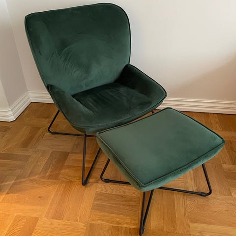 Grønn design stol kjøpt på Finn for 2500 kr for noen måneder siden, selges kr 1000. En kul og flott stol, men tar litt for stor plass for stuen vår.