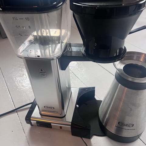 Veldig god kaffetrakter. Har noen brister i lokk, men er uten betydning for kaffelaging. Hendel som stopper kaffe å renne ned i kolben er ødelagt. Så kaffen renner gjennom uten at en av en eller annen grunn skulle ønske å stoppe den. Kan tas med når vi reiser mot Stavanger om ønskelig, eller sendes i posten.
