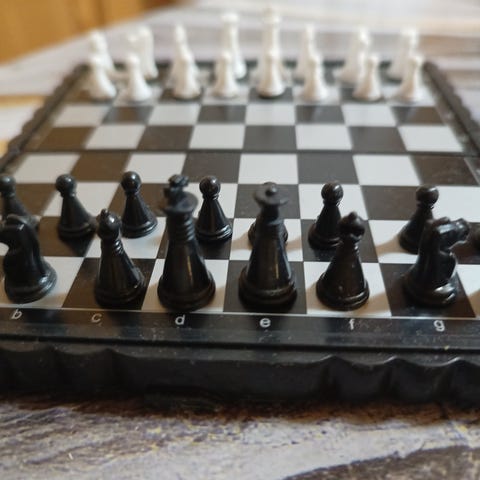 Sjakkbrikker sett i tre i fargene svart og naturfarget. Brikkene leveres i rød eske med inndeling for lyse og mørke brikker. Standard utforming av konger, dronninger, løpere, springere, tårn og bønder. Egnet til bruk med vanlig sjakkbrett i tilsvarende størrelse som brikkene er laget for. Esken er merket «Made in W. Germany».king er 7,5 cm ca . Esken bærer preg av alderdom slik bildene viser . Men innhold er fint