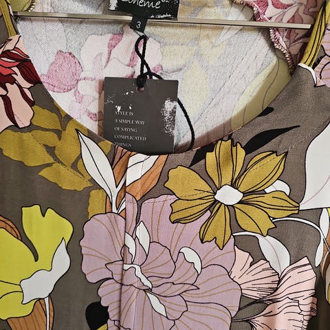 Str 3 fra Boheme, tilsvarer 44-46. Sydd et felt med rynker under brystpartiet som gjør at den faller fint.