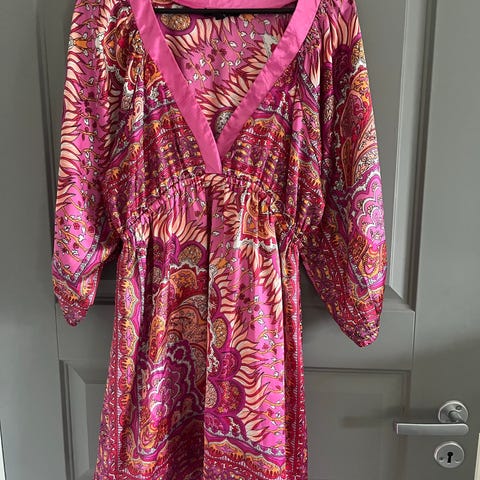 Hel lengde 120 cm, brystvidde 60cm x2. 100% viskose. Liker du lange kjoler og er glad i farger vil du få mye glede av denne.