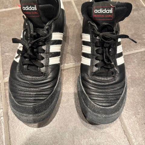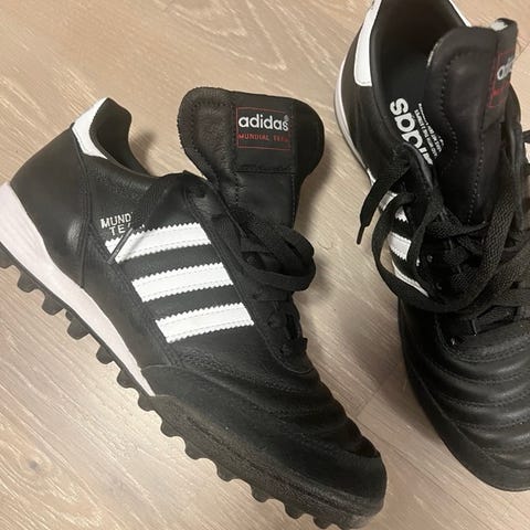 KI generert: Adidas Mundial Team fotballsko i svart lær. Modellen har klassisk Adidas-design med tre hvite striper på sidene. Overdelen er i skinn med snøring foran. Yttersålen har mange små knotter som gir godt grep på harde underlag som kunstgress eller grus. Skoene har polstret pløse og hælparti for økt komfort under bruk.