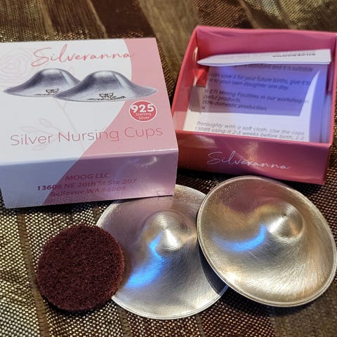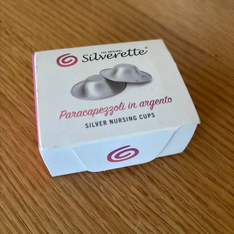 Silverette ammeskjold i sølv. Produktet består av to sølvkopper som legges over brystvortene mellom amming. Følger også med en eske med 9 multi-mam kompresser.