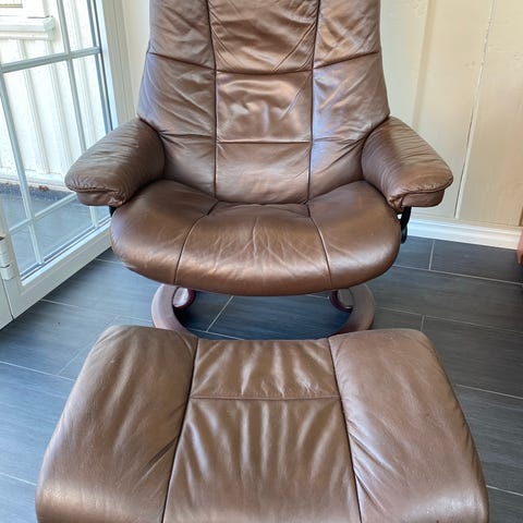 Veldig gode å sitte i og slappe av i, nedleggbare trinnløse stoler hvor hodeputa kan løftes opp i passende stilling. Pent brukt.