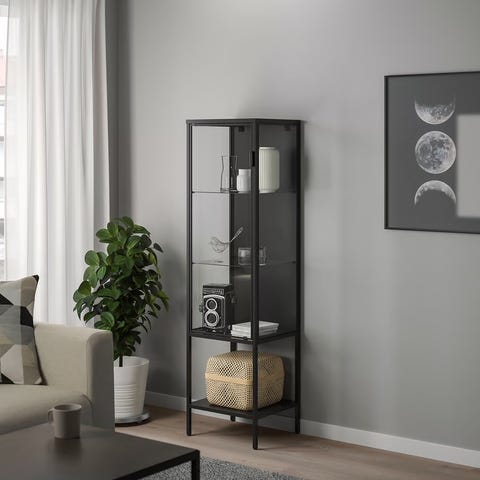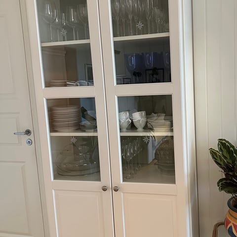 Vurderer å selge et pent vitrineskap fra europris. Pent brukt, har noen merker på toppen, små bobler fra vann som ikke har blitt tørket opp. Selges som det er, må hentes. Se mål på bilde