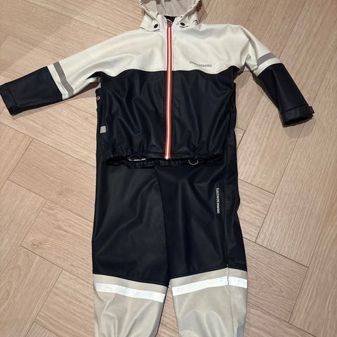 Pent og lite brukt sett med regnbukse og regnjakke fra Didrikson. God kvalitet med forsterkninger på knær og rumpe for å forhindre hull. Ingen tegn til jordslag eller andre bruksmerker, annet enn at stroppene under benene er borte. Enkelt å erstatte med knapper til å feste på nye.