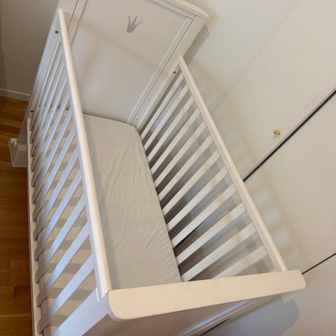 Pent brukt Ikea Gonatt sprinkelseng selges rimelig. Må hentes på Løren i Oslo. Noe bruksmerker men i god stand. Følger med laken til madrassen.