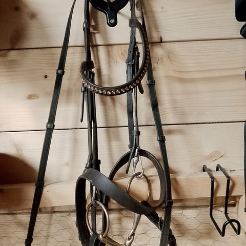 Nydelig Utzon kandar hodelag i kvalitetslær. Svart med hvit padding og lakk. Str Cob. Utrolig mykt lær. Tykk trykkavlastende nakkereim. Utzon pannereim med store swarowski steiner. Kan brukes som vanlig trinse. Ingen skader. Nypris 6900,- Selges 2500,-