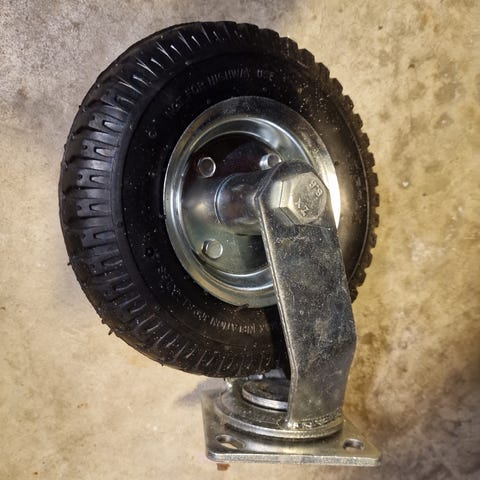 Trillebårhjul med dimensjon 4.00-6. Hjulet er montert på metallfelg med nav og aksel. Egnet som reservehjul eller erstatningshjul til trillebår eller lignende utstyr som bruker samme hjulstørrelse og akseldimensjon.