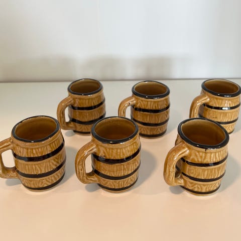 8 Vintage snapsglass, ser ut som små tønner. 5cm høy.