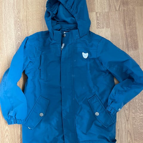 Polarn O. Pyret WeatherPRO jakke for barn i størrelse 116. Jakken er grønn og laget i polyester. Den har høy krage, glidelås med stormklaff og refleksdetaljer. På ermet er det et påsydd motiv. Innsiden har nettingfôr og stripete tekstil. Unisex-modell egnet som ytterjakke i overgangssesonger.