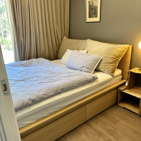 Pent brukt Ikea Malm seng i størrelse 180X200 i hvitbeiset eikefiner.