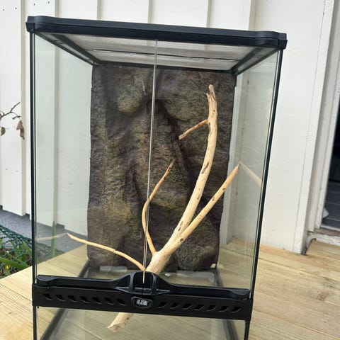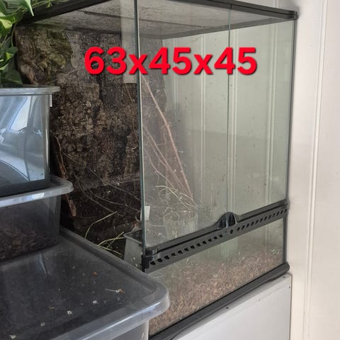Selger ett Exoterra terrarium med glassvegger og metallramme. Terrariet leveres med 2x LED-lys montert i lokket tidsstyring, 2x usb vifter til sirkulasjon, Eheim kompaktpumpe (CompactON 1000) og styringsenhet for spray- eller tåkesystem (Mius Smart). Det følger også med svart filter media litt pinner bark og cocofiber. Og noen nett Potter og byggskum.
