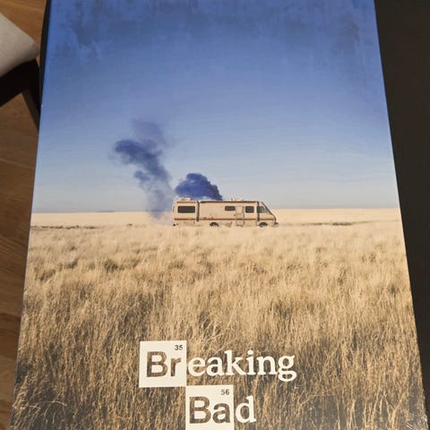 Breaking Bad komplett serie DVD samleboks. Inneholder alle sesonger av TV-serien fordelt på flere DVD-plater i egen samleboks. Omslagene har motiv fra serien, og hver plate er merket med sesong og innhold. Egner seg for avspilling på standard DVD-spillere som støtter formatet.