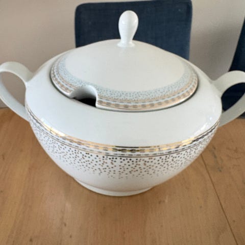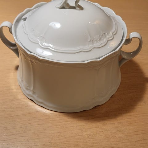 Klassisk serveringsskål med lokk i hvitt porselen med dekorative detaljer. Fin til servering eller som pynt. Selges som den er.