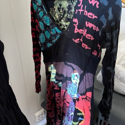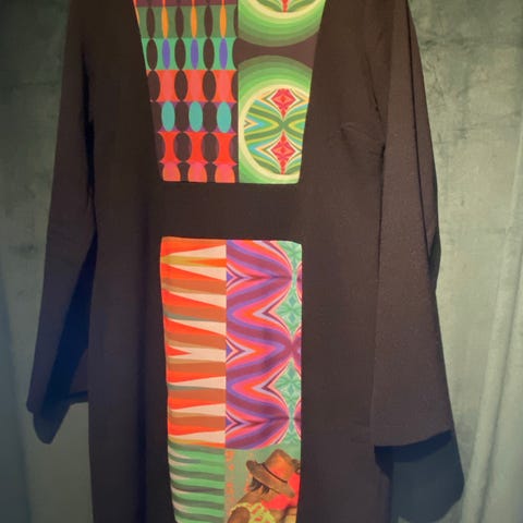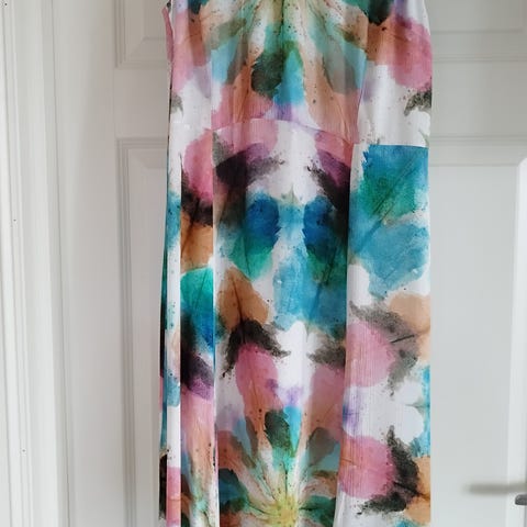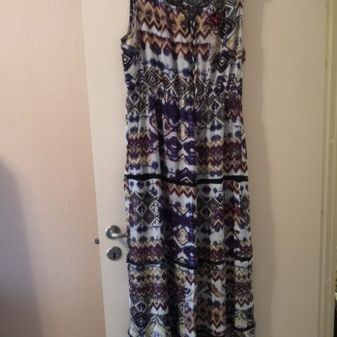 Desigual midi kjole i størrelse 42. Materialet er viskose, som gir et mykt og lett stoff. Modellen har lange ermer, v-utringning med knapper og knyting i livet foran.