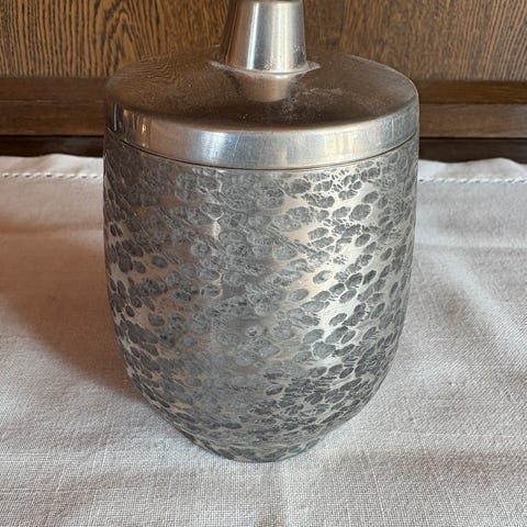 Søt gammel kjeksboks i lys blått glass med lite lokk. Lokket har en liten skade, men fungerer fint. Pen til små kjeks, til pynt eller med lys i eller blomster. Kjøper betaler frakt.