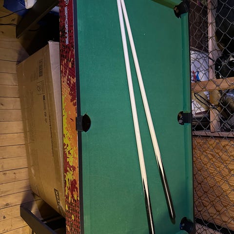 Settet inkluderer fotball, airhockey med køller og puck, biljard, samt bordtennisplate med nett, to racketer og ball. Bordet er beregnet for plassering på bord eller annen flat overflate og egner seg til innendørs bruk.
