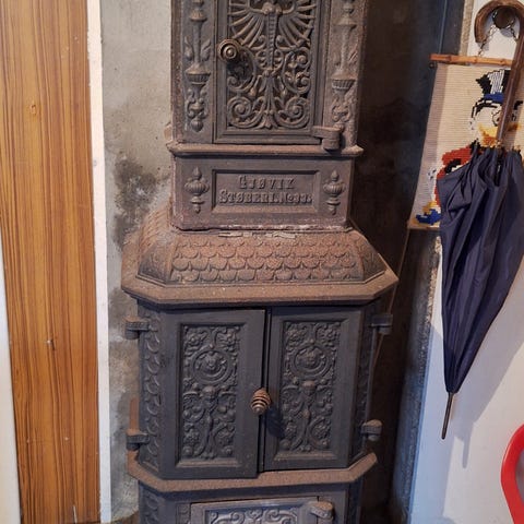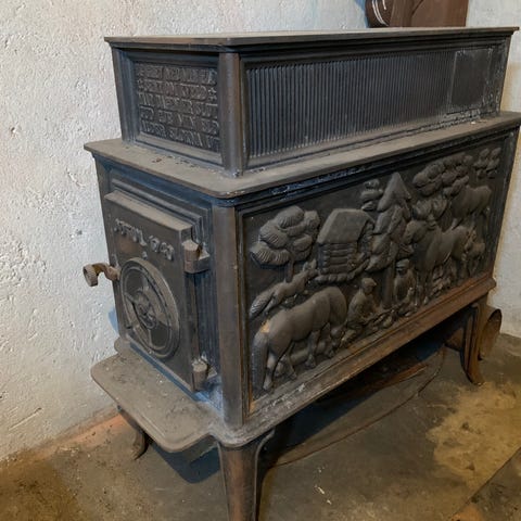 Jernovn antikk vedovn med relieffmotiv på sidene. Ovnen er laget i støpejern og står på et separat understell i tre med utskårne detaljer. Fronten har dekorativt motiv i relieff som viser figurer og hest. På siden er det fyringsdør i metall med luftespjeld og håndtak. Ovnen har en sideplate som kan brukes som avlastningsflate. Egner seg som vedfyrt ovn eller som dekorativt innslag i interiør, for eksempel i stue, hytte eller andre oppholdsrom der man ønsker en tradisjonell og historisk preget ovn i støpejern.støpt i Moss i 1787.