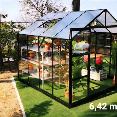Drivhuset har dobbel skyvedør med mål 197cm høyde og 121 cm bredde, 2 store manuelle takluker.