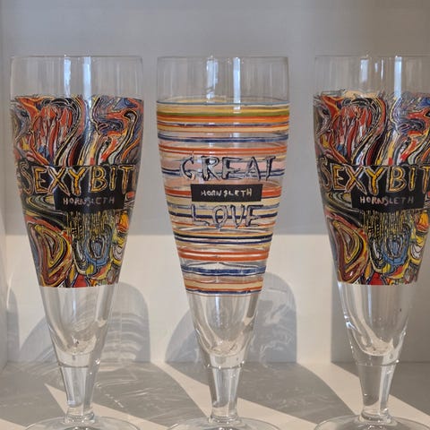 Har ett ølglass fra det tyske ølbryggeriet Veltins, og ett smalere glass fra danske Faxe. Veldig fine samleobjekt, som jeg ikke har plass til, men ikke vil kaste.