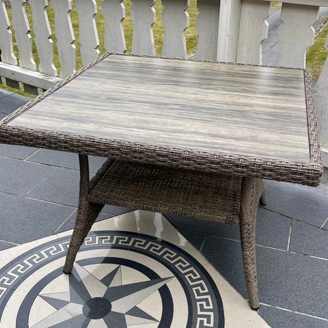 Hagebordet har rektangulær bordplate og understell i flettet kunstrotting. Litt skadet på den ene tverrsiden under bordet. (Se bilde) Bordet står på fire ben med lett buet utforming.